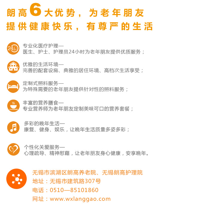 机构成立于2009年,是无锡首家医养结合的老年医疗护理机构和社会老年服务机构。为老年朋友提供生活照料,医疗护理、康复理疗、老年旅游、老年心理咨询等一系列服务,真正意义上体现“医养结合、康体健身、休闲娱乐、心理疏导、生活照料、临终关怀”六位一体的现代养老服务体系。医疗机构与养老机构融合的新型养老服务模式,给老人提供更加科学、完善、优质、综合的服务。