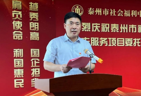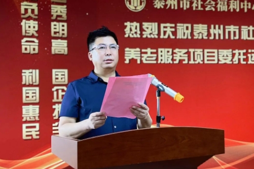 越秀朗高副董事长、总经理涂家钦在仪式上致辞。他向所有关心支持泰州市社会福利中心养老服务项目的各级领导、泰州市社会福利中心职工、入住长者和家属,致以热烈欢迎和衷心感谢。这次越秀朗高以评标第一名的成绩中标泰州市社会福利中心养老项目,首先要感谢泰州市各级政府部门的关心和支持,以及泰州市社会福利中心的信任。越秀朗高一定不负重托,充分发挥自身的连锁运营管理经验和专业服务,选派最优秀的管理团队和服务团队,依法办院、合法经营,竭力为泰州老百姓提供有温度、有专业、有责任、有口碑的养老服务。他向运营养老项目的朗高团队提出以下几点要求:一是要继承优良传统,厚植孝爱情怀;二是发挥医养融合,为老有所依建立“新”制度;三是整合多方资源优势,为老有所养创造“新”环境;四是创新探索服务品牌,为老有所为营造“新”氛围。全力将该项目打造成“全国上乘、全省一流”的公建民营、医养结合示范养老机构,助力泰州养老事业蝶变升级、高质量发展。