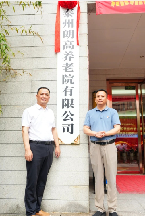 泰州市社会福利中心副主任罗厚义与泰州朗高养老院、泰州朗高医养护理院院长何清共同为“泰州朗高养老院有限公司”挂牌。